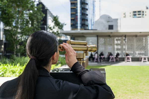 The theodolite’s design draws from a 19th-century antique, while its plinth speaks to the vertical rise of architecture within Hoddle’s grid, a nod to the city’s evolution from mapped lines to towering forms.